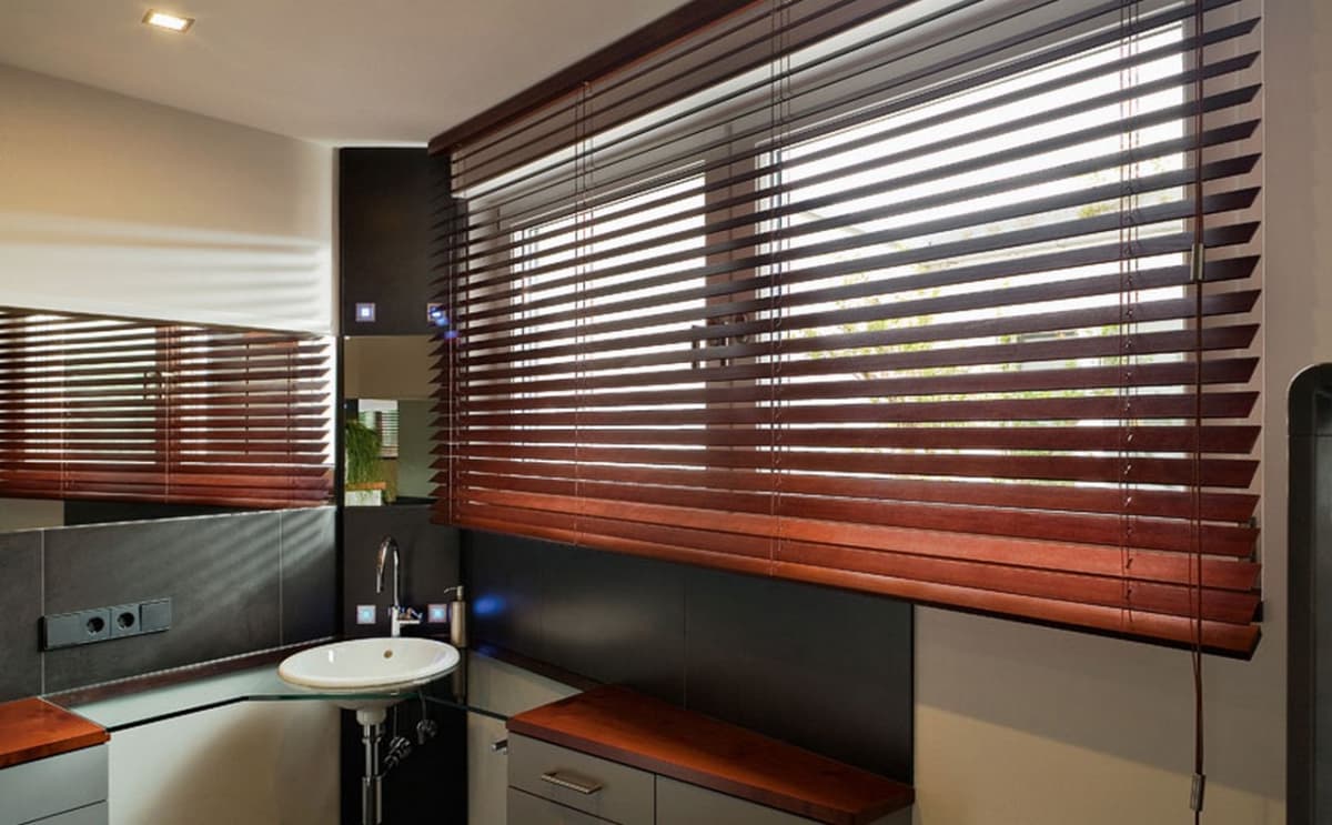 Деревянные жалюзи для ванной — конструкция с ламелями из дерева, которая предназначена для регулирования освещения и защиты от посторонних взглядов.